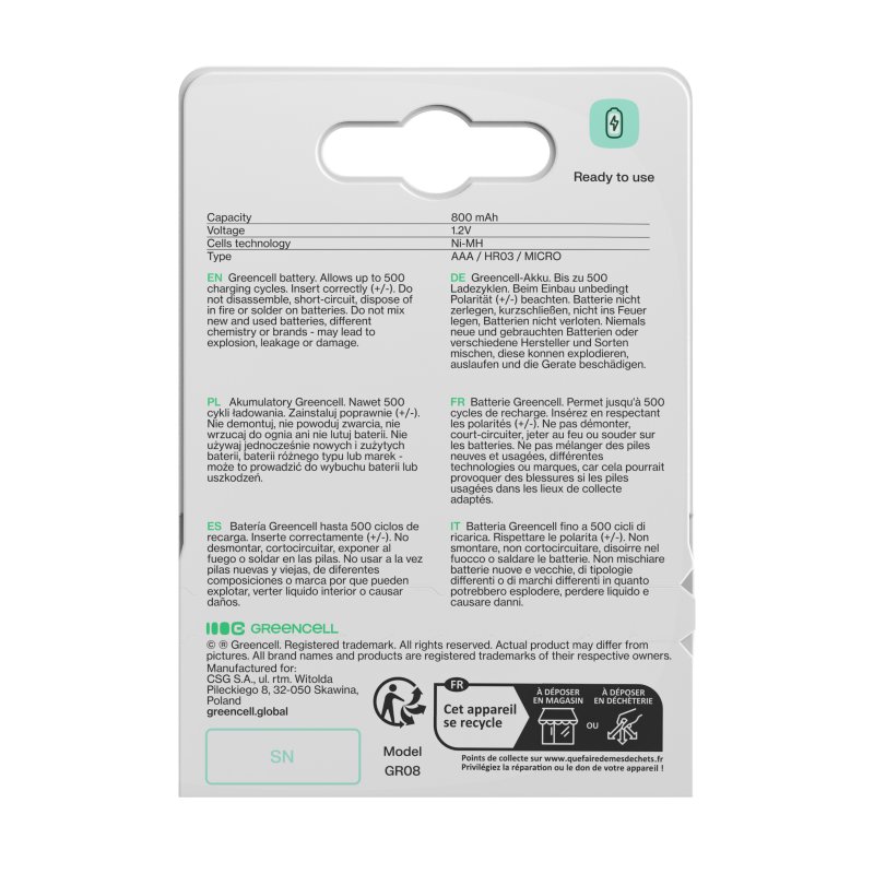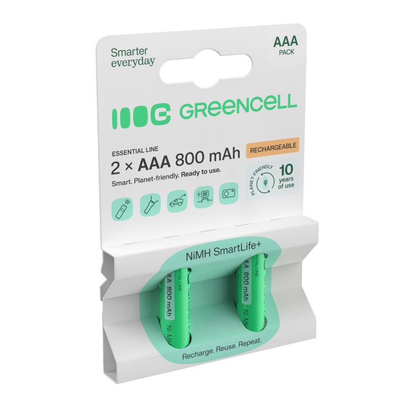 Queste sono batterie che possiamo usare allo stesso modo in cui usiamo le batterie usa e getta AAA. Le batterie Greencell si differenziano per la possibilità di ricaricamento, riducendo così il costo dell'utilizzo di molti elettrodomestici alimentati da batterie tradizionali. Sono caratterizzate da una capacità elevata e reale - 800 mAh, che garantisce tempi di lavoro più lunghi rispetto alle batterie usa e getta.