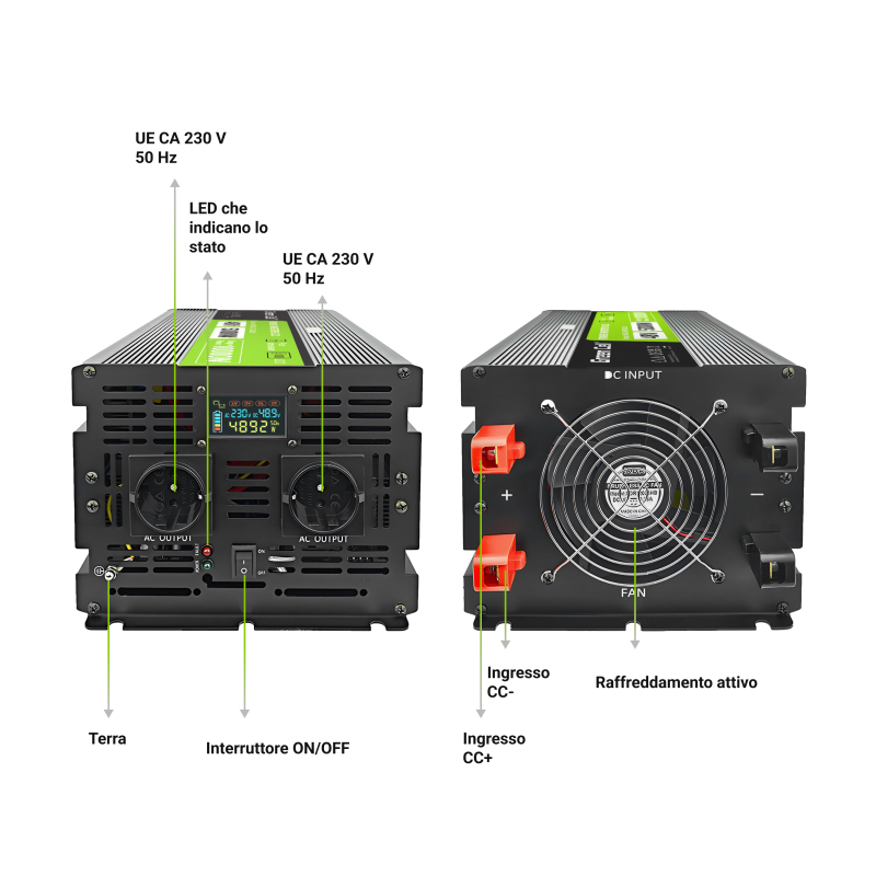 Un inverter è un dispositivo autonomo che si collega alla presa dell'accendisigari o direttamente alla batteria. Il suo compito è convertire la tensione 12V/24V dal sistema CC dell'auto in 230V CA. Per questo motivo, molto spesso si trova accanto al nome dell'inverter la seguente sigla: DC/AC.